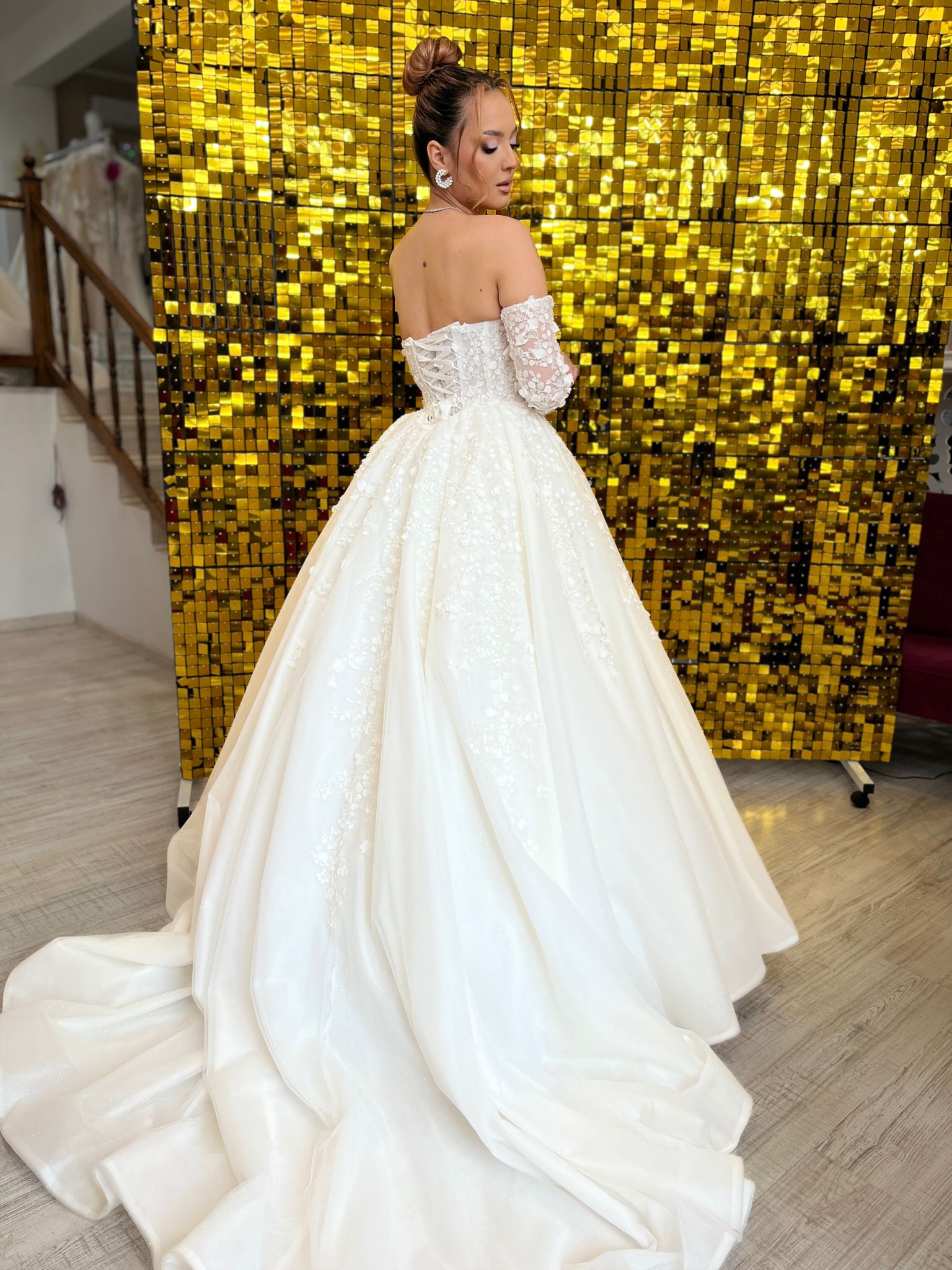Fusta amplă, confecționată din straturi vaporoase de tulle fin, oferă volum și lejeritate, specifică unei rochii de mireasa stil printesa. Materialul fluid se mișcă elegant la fiecare pas, iar florile 3D aplicate discret creează o tranziție delicată între corset și fustă. Această combinație oferă un echilibru perfect între structură și lejeritate.
