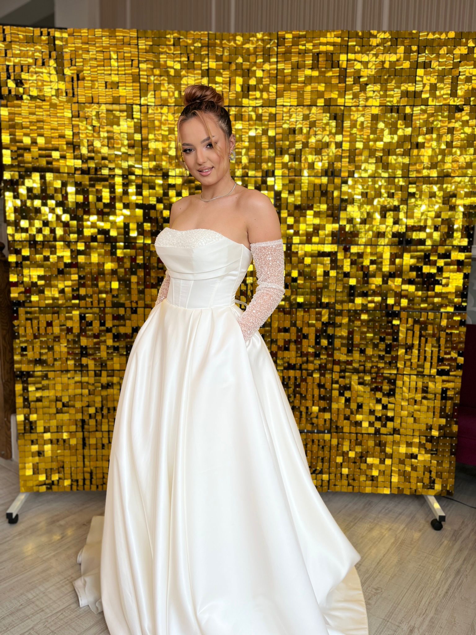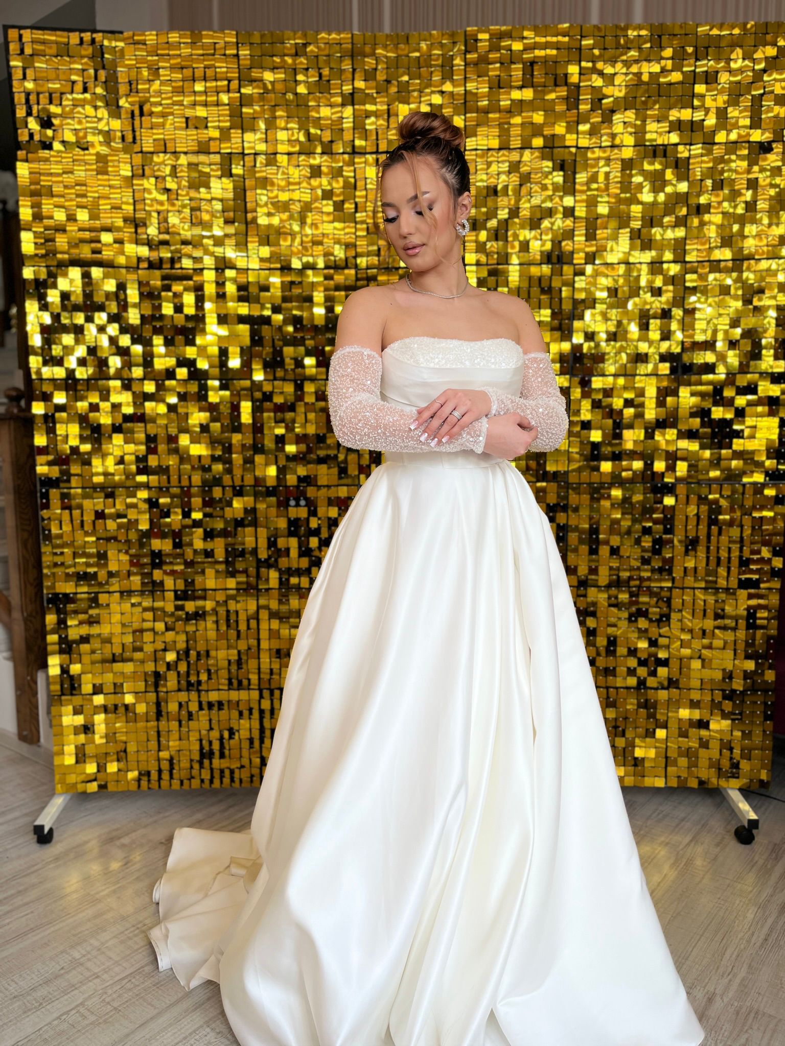 Partea frontală a rochiei impresionează prin simplitate și echilibru. Bustul este elegant conturat, oferind susținere și o linie feminină, iar decolteul delicat evidențiază zona bustului într-un mod rafinat. Umerii goi și mânecile lungi detașabile adaugă un aer romantic și modern, fiind ideale pentru miresele care își doresc un look sofisticat, dar confortabil.
