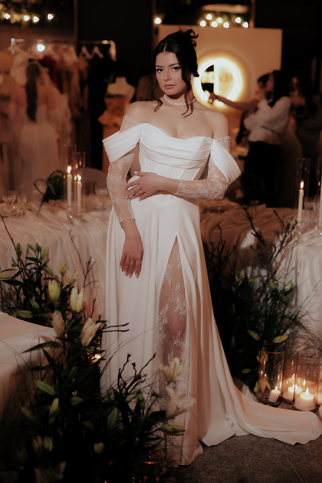 O rochie de mireasă A-line cu dantelă Chantilly este alegerea perfectă pentru o apariție romantică, delicată și extrem de feminină.